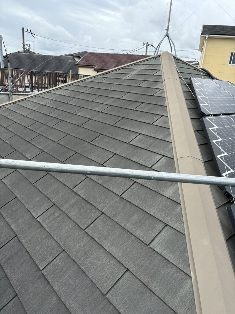 屋根は高圧洗浄後、板金錆止め・板金釘頭シーリング充填を行い、下塗り2回上塗り2回の計4回塗りで塗装しました。